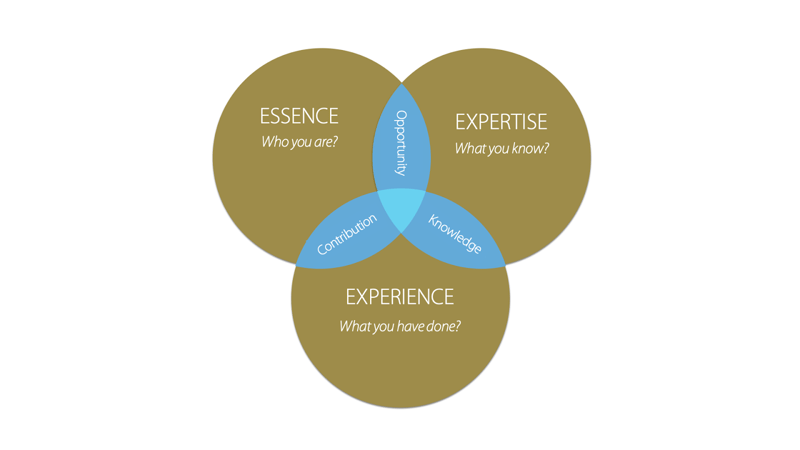 These elements: your essence (who you are), your expertise (what you know), and your experience (what you have done) combine to create your ‘unique genius’. The intersections between them lead to your commercial opportunities, your saleable knowledge, and valuable contributions. Take some time to think through what your elements might be. Your answers to these placeholders are clearly unique to you, there is no right answer, just yours! As you sharpen your angle over time, you use these elements and the below model as a map of sorts, perhaps a compass giving your practice direction and location. Using these elements, you start to see where you want to take your practice and perhaps more importantly what are you about, right now.
